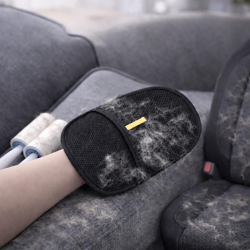 Notre gant capture rapidement les poils sur vêtements, canapés et sièges de voiture.